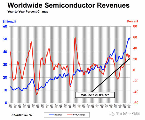 半導(dǎo)體行業(yè)協(xié)會 (SIA) 統(tǒng)計數(shù)據(jù)顯示,2022年第一季度全球半導(dǎo)體銷售額達到 1517億美元,較去年同期增長23%。但比2021年第四季度低0.5% 。2022年3月全球銷售額為506億美元,環(huán)比增長1.1%。